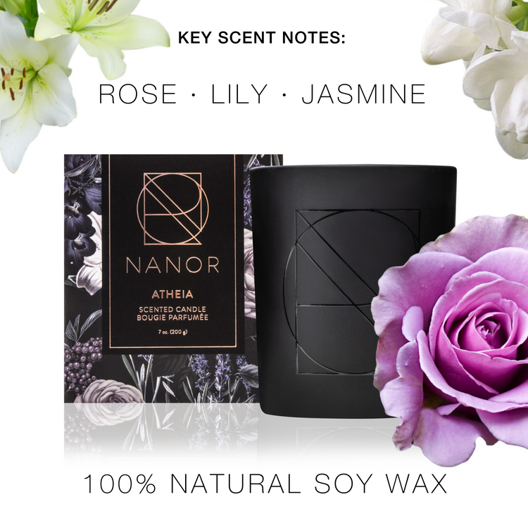 Let yourself be carried away into an exclusive garden of the finest blossoms with our ATHEIA scented candle. Perfect for flower lovers, this luxury floral scent adds a sense of beauty and bounty to your most cherished space. Its delicate notes of rose, jasmine and lily mingle to form a well-balanced floral bouquet that’s plentiful without being overpowering, leaving you feeling joyful and light.